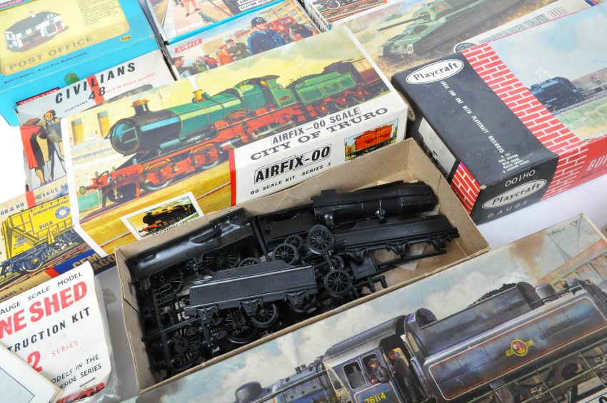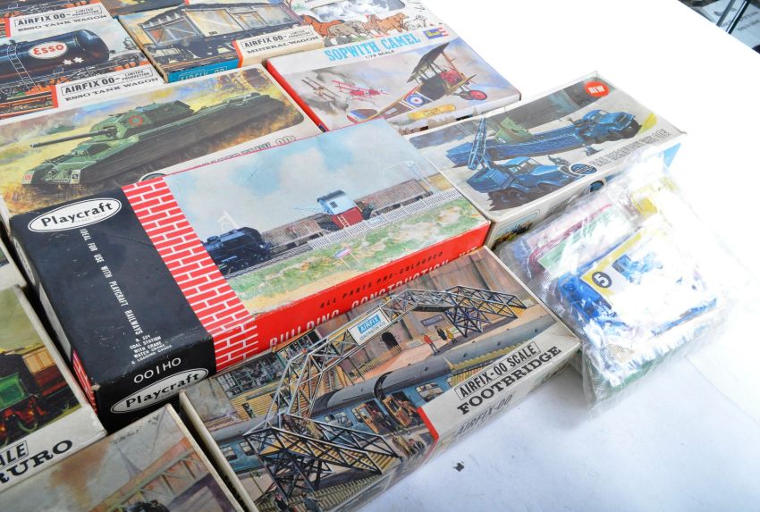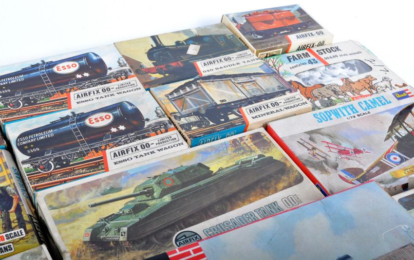 A large collection of assorted 1/76 scale / 00 gauge Airfix plastic model kits. The collection largely of model railway / trainset interest including wagons, locos, trackside accessories along with some military tank / aviation models. Contents largely unassembled but this remains unchecked by us.