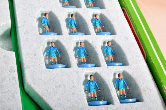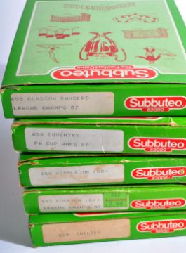 A collection of x5 original vintage Subbuteo 63000 table top football team sets to include; 618 Chelsea, 643 Everton, 650 Wimbledon, 655 Glasgow Rangers and 659 Coventry. All sets appearing complete, within original boxes.