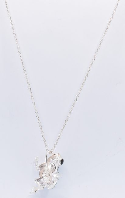 A silver and cubic zirconia pendant necklace. The pendant in the form of a frog and having CZ's and green stones to the back and the eyes being set with black stones. The pendant upon a tracer chain with lobster clasp. Total weight 8.93g. Chain measures approximately 46cm in length. Pendant measures 30mm length.