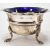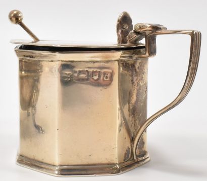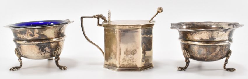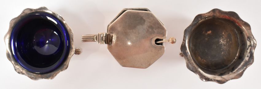 A group of three silver hallmarked cruets to include two Barnett Henry Abrahams flared rim table salts (one missing blue glass liner, one with rubbed hallmarks the other marked for Birmingham 1900) and a lidded mustard pot of octagonal form (hallmarked London 1899, makers marks rubbed). Silver weight 106.9g. All measure 4cm tall.
