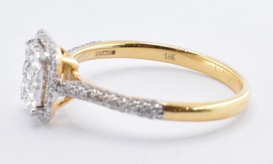 An 18ct yellow gold diamond cluster ring. The ring having a central round cut diamond surrounded by eight diamonds and the further halo of diamonds. The shoulders also each having three rows of diamonds within pave settings. The principle stone an estimated 7pts. Total weight 2.74g. Size N.5.