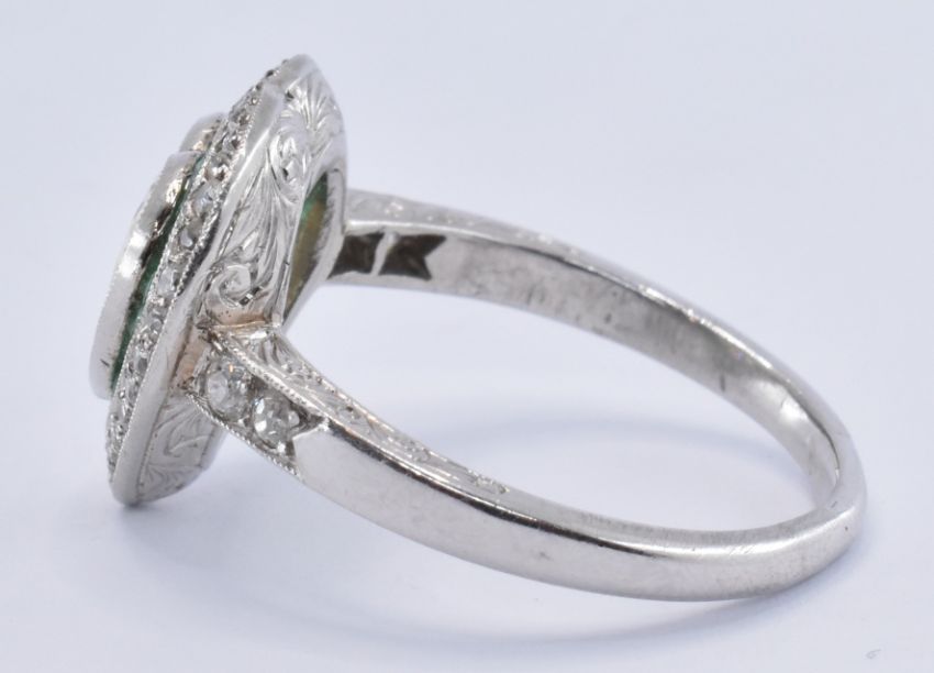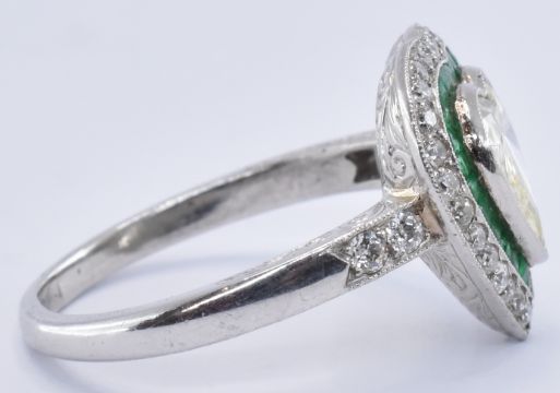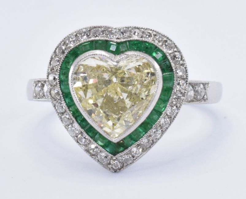 A contemporary Art Deco style yellow diamond dress ring being bezel set with a heart shaped yellow diamond surrounded by square cut emeralds and round cut diamonds with further round cut diamonds to the shoulders. Unmarked tests as platinum to the shoulders and white gold to the band. Principle diamond measures 8.8 x 8.7 mm. Size R. Weight 7.3g.