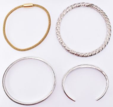 A group of silver bracelets to include a gilt silver popcorn bracelet (17.5cm circumference), a twisted design bangle (18cm circumference), a hallmarked oval bangle (hallmarked Sheffield 2001),  and a wave design bangle (15cm circumference). All marked 925. Weight 102g.