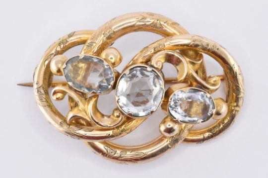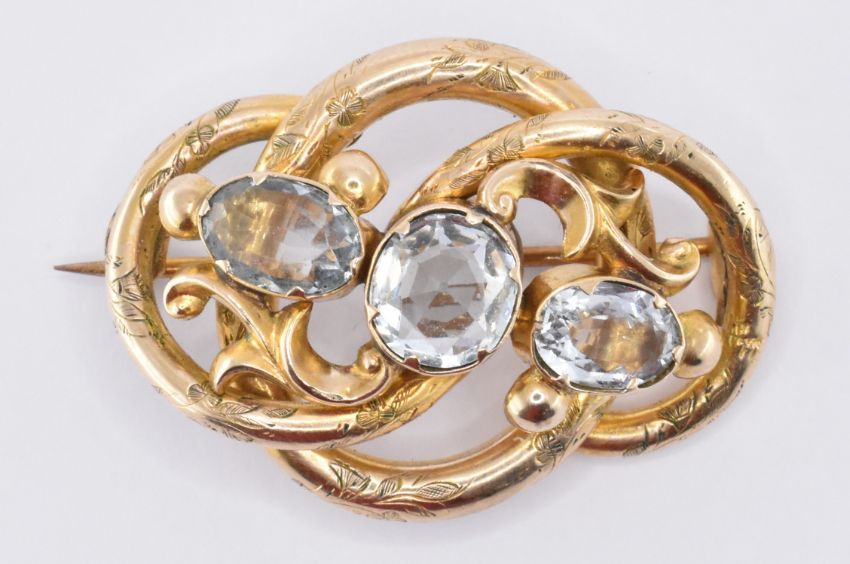 A 19th Century Victorian gilt metal knot brooch being set with a central round cut  aquamarine  flanked by two further oval cut aquamarine with engraved decoration to the mount. Measures 3.5cm wide. Weight 9.5g.