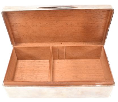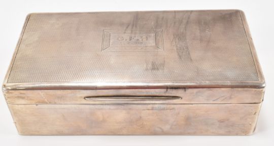 A hallmarked silver circa 1920s cigarette box of rectangular form having engine turned decoration to the lid with 'G.F.H 1.12.1930' engraved to the centre. The wooden interior having two compartments within and having red leather to the base. Hallmarked for London, 1929. Measures 5cm x 18cm x 9cm. Total weight 438g.