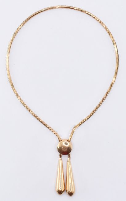A 9ct gold snake chain friendship bracelet having two drop shaped terminals with a round sliding clasp. Assay marked Sheffield 375. Weight 7.0g. Chain measures approx 9 inches with adjustable clasp.