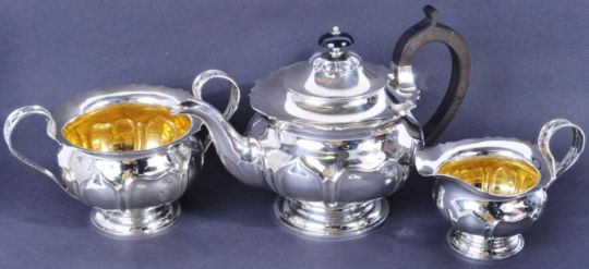 An Edwardian hallmarked silver tea service set by Walter Latham & Son. The set comprising a tea pot with ebonised wood handle and finial top along with a sugar bowl and milk jug with gilded interiors. Hallmarked for Sheffield 1912. Total weight 1271g. Teapot measures 17cm tall.