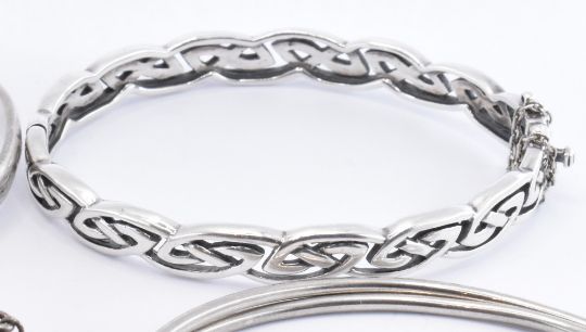 A collection of silver bangle bracelets to include a hallmarked hinged bangle bracelet (hallmarked Birmingham 1971), a celtic knot design bangle, a hammered fish bangle etc. All marked silver. Weight 80.7g. Largest measures 19.5cm circumference, smallest 15.5cm.