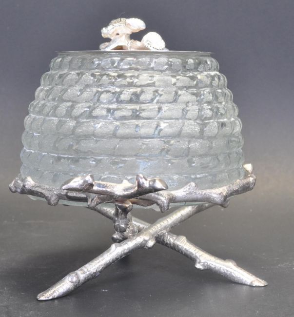 A contemporary glass honey bee pot on silver plated stand. Bee decoration to the lid, honeycomb shaped glass pot, raised on a twig style base. Good condition. Measures 14 cm tall.