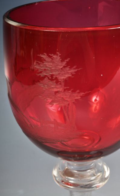 A 19th Century etched cranberry glass drinking wine goblet in the manner of Moser having a pink cranberry glass bowl with well defined etched Stag in open field with trees and foliage. The bowl raised on a twisted stem with stepped bladed knop raised on a broad circular foot. Some minor flea bites to rim, overall appears in good condition. Measures 21 cm tall.