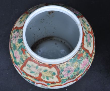 A vintage 20th century Chinese Oriental lidded vase having a gold finial with polychrome decoration. Together with a vintage 20th century Cloisonné vase having a black background with polychrome floral decoration throughout. Largest measures 32cm. Signs of wear and tear commensurate with its age.
