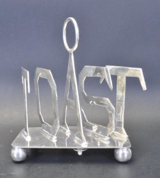 A vintage style silver plated toast rack having a carry handle to the top, dividers spelling toast raised on bun feet. Good condition. Measures 14cm x 13cm x 7cm.