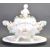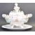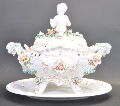 A mid 20th century circa 1940’s Italian ceramic porcelain Meissen style centre piece bowl / tureen. The large porcelain centre piece of an oval form with pierced body having a cherub to the top / lid in sitting position surrounded by colourful flowers, twin handles in a form of cherub heads and wings raised on shaped legs complete with original matching oval platter. No makers marks. Condition: good overall. General wear and tear, crack to the platter and some damage on the flowers.