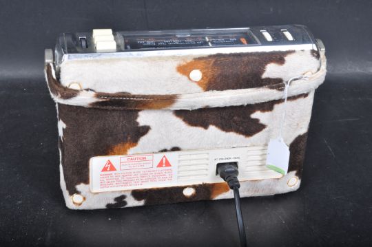 A retro vintage Bush TR130 transistor radio upholstered in faux cowhide with carry handle to the top. Measures 24cm x 17cm.