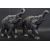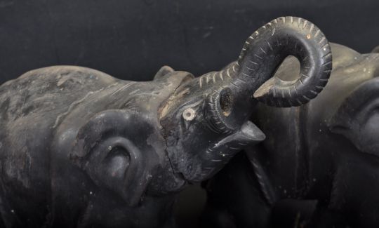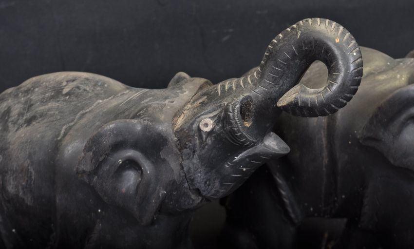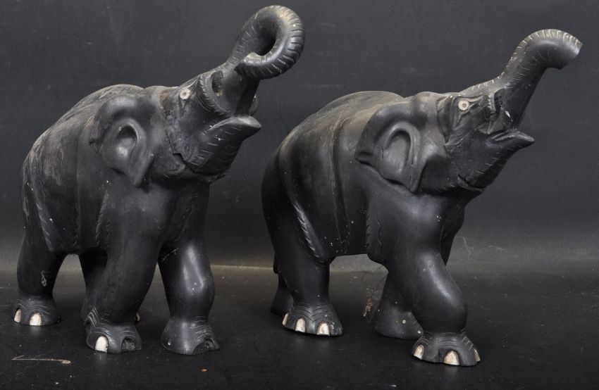 A pair of early 20th century ebony elephants having carved features both raising their trunks. Measures 23 cm x 23 cm.  A/F
