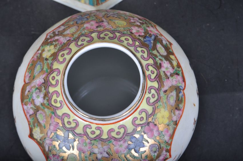 A collection of vintage 20th century Chinese / Oriental Famille Verte ceramic china comprising comprising of a large floor standing case, lidded ginger jar, bowl and more. Largest measures 60cm.