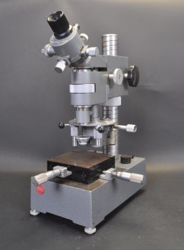 A vintage retro 20th century German made Leitz Wetzlar Miniload micro hardness tester. The miniload system tester is used for non destructive hardness tests with loads below 1 kg. The system is ideal for the inspection of tool edges, wires and failure investigations. The Mini load hardness tester produced by Leitz can be used to examine metallurgical samples at a magnification of up to 400x, offer precise measurement of coatings and micro structural features. The miniload tester / specialist engineer microscope having an indemnification plaque to the back reading Ernst Leitz GMBH Wetzlar type 060-366.002 No. 843570 to the base, Leitz Wetzlar Germany 808756 impressed mark to the body and Leitz Wetzlar Germany 5960 to the eyepiece body. Condition: Good condition, used condition, appear to be in working condition but sold as untested. Measures 47 cm tall.