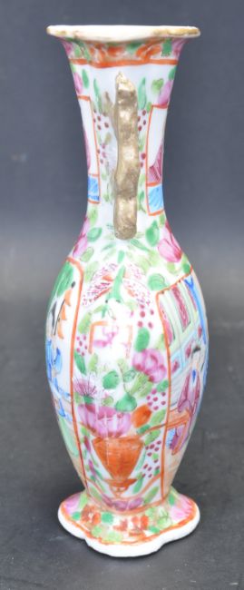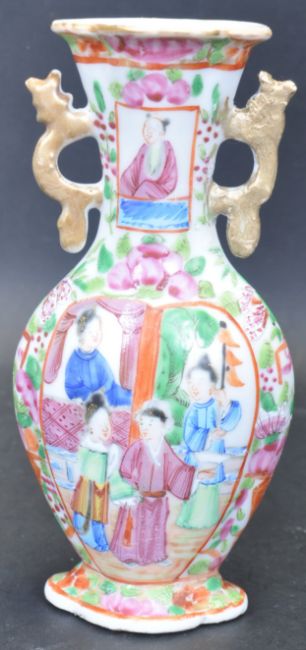 An early 20th century Chinese / Oriental Famille Rose vase having gilt dragon handles to the neck with polychrome decoration of flowers and insects with a central panel of figures raised on a scalloped base. Measures 15cm high.