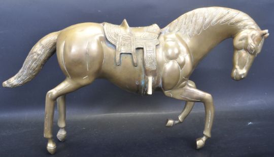 A large 20th century brass horse rearing on two feet having textured decoration to the tail and mane. Measures 31 cm x 57 cm.