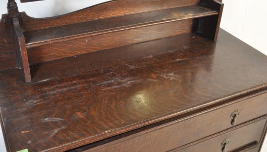 A mid 20th century circa 1940s post war oak dressing table chest having a single rectangular tilt mirror atop a bank of three drawers raised on supports united by stretchers