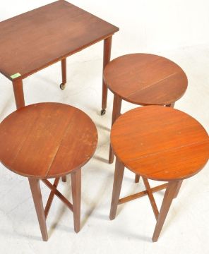 A retro vintage mid 20th century teak wood nest of tables having a square table top with three drop leaf tables underneath raised on tapering legs & castors. Measures: 57cm x 63cm x 45cm.