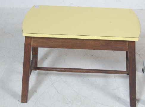 Two vintage retro 1970's ceramic coffee tables / occasional tables. One having a rectangular teak wood top raised on chrome metal frame with casters, along with another melamine coffee table of a rectangular form.42cm h x 40cm w x 32cm d