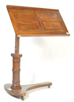 A 19th Century Victorian mahogany J Carter's Carters Literary Machine adjustable library reading book stand lectern having an adjustable metamorphic top raised on thick turned column with cast metal adjustable mechanism over lozenge shaped wooden base on brown ceramic castors. 81cm x 44cm (height adjustable)