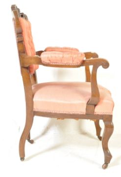 A Victorian 19th century mahogany armchair in the rococo manner. Raised on shaped legs with castors, pink silk upholstery with show wood top rail
