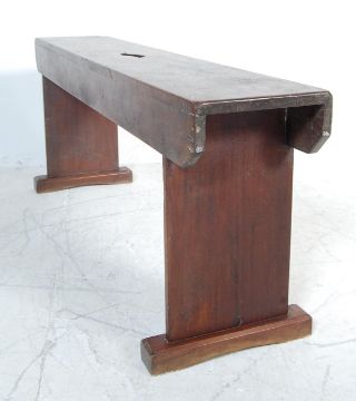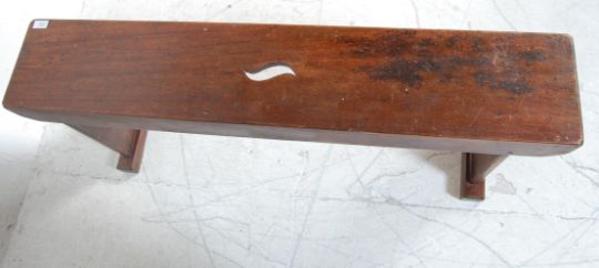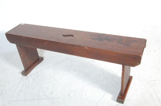 A 19th century Victorian pine bench / window seat. The bench of a short rectangular form having cut out decoration to the centre, rounded corners frieze to each side raised on T shape legs. 47cm h x 121cm w x 24cm d