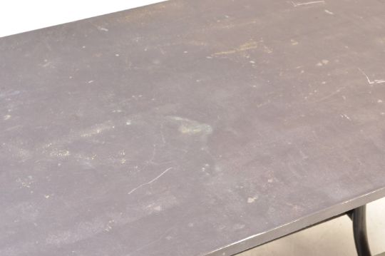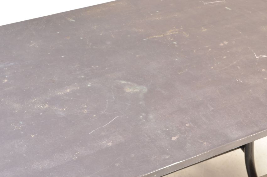 A contemporary slate topped picnic table of rectangular form having an ebonised metal frame. Comes with two lower slate topped benches.