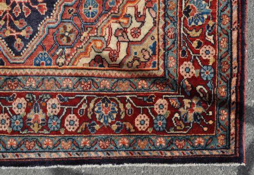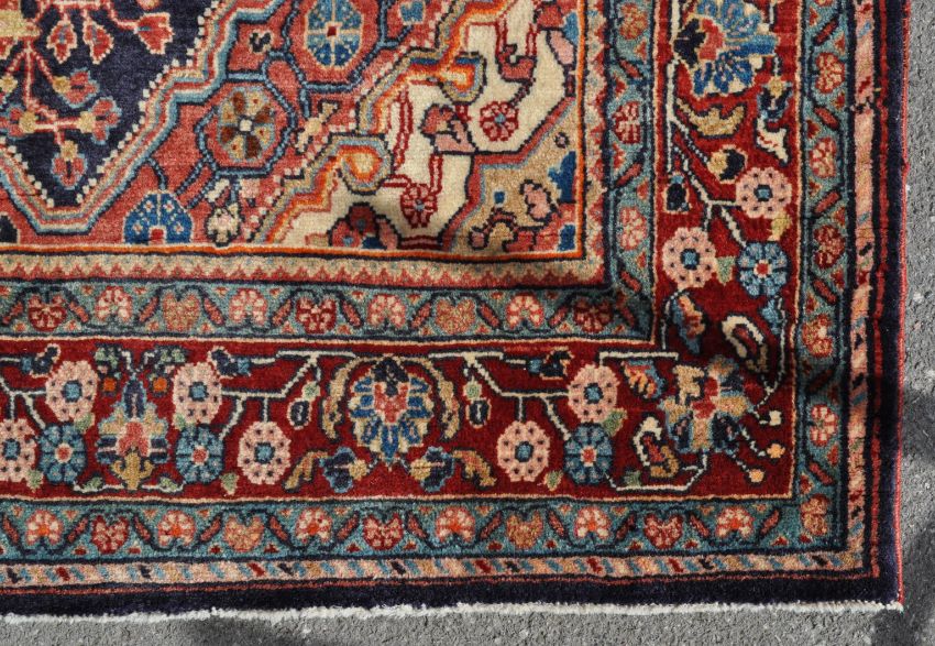An early 20th century circa 1940’s hand woven Sarouk carpet rug. The Persian Islamic rug having a large diamond shaped medallion to the centre set on a dark blue field decorated with multiple floral motifs. White fringes to each end and red pile direction. Measures: 200cm x 131cm