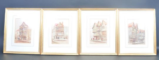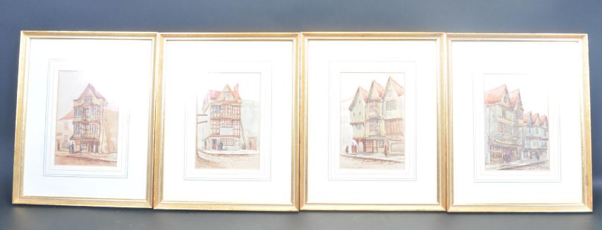 Ernest Parkman (1856-1921) - A group of four late 19th century Victorian Bristol related watercolour painting by E. Parkman. The collection includes: Old Houses In Pithay (Demolished 1886), Ancient Houses In Lewins Mead, Fourteen Stars Tavern - Counter slip, Ancient Timbered House Lewins Mead ( Demolished 1886). Artist signature to the lower corner. Framed and glazed. Measures 34 cm x 27 cm.
