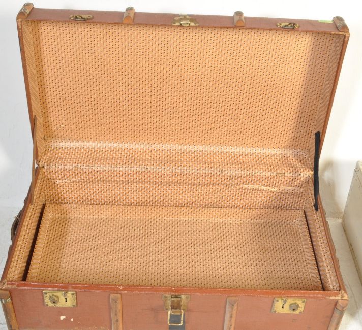 A group of vintage retro mid 20th century shipping trunks / storage boxes. The collection includes a wooden banded trunk with metal locks to the front together with another suitcase and two lidded boxes. Condition: good used condition.