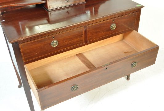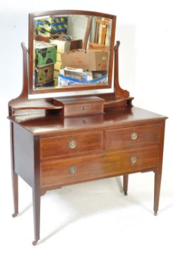 An early 20th century Edwardian mahogany inlaid dressing table. The table having bevelled glass mirror with shaped supports over a single door with shaped top above two over one drawer configuration raised on shaped legs with brass casters. Measures: 154cm x 108cm x 50cm