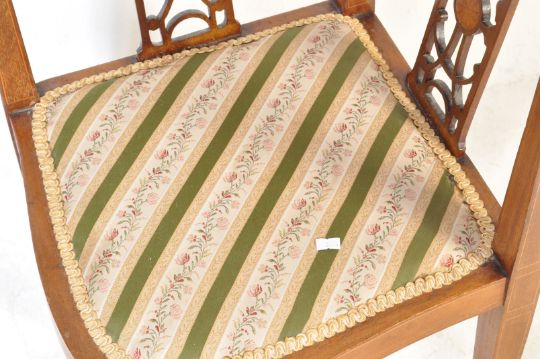 An Edwardian mahogany and marquetry inlaid corner chair being raised on square tapering legs with spade feet, Regency stripe fabric and pierced gallery uprights to top rail