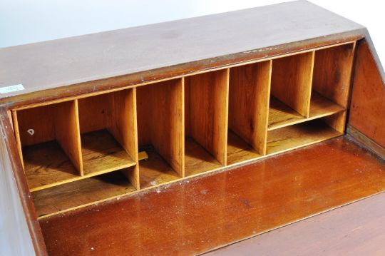 An Edwardian mahogany and inlaid bureau desk. The bureau having an inlaid fall front opening to reveal a fully appointed interior atop a bank of three drawers raised on bracket feet. measures, 99cm x 76cm x 44cm.