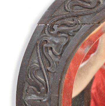 An early 20th century circa 1910's oak carved wall mirror. The mirror of a circular form with bevelled glass set in a oak carved frame with carved foliate motifs. Condition: Good over all, to small splits on the frame (need reglue)
