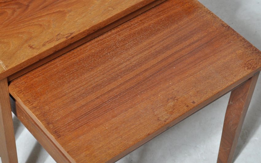 A vintage retro 1970’s danish inspired teak wood nest of tables. The three graduated tables having a rectangular top raised on tapered shaped legs. Measures 45cm h x 53cm w x 37cm d