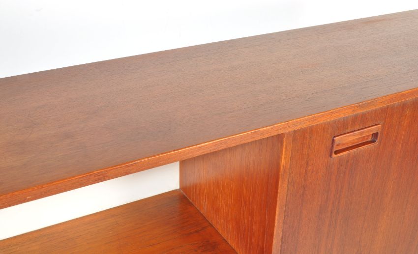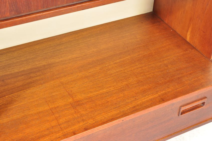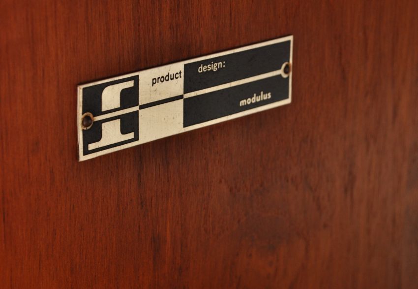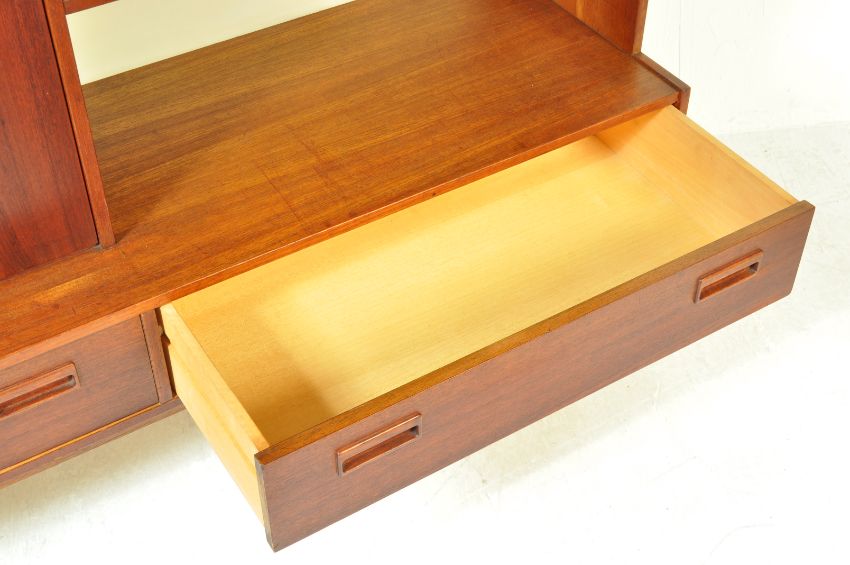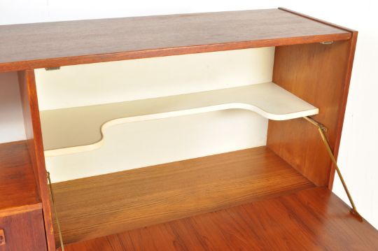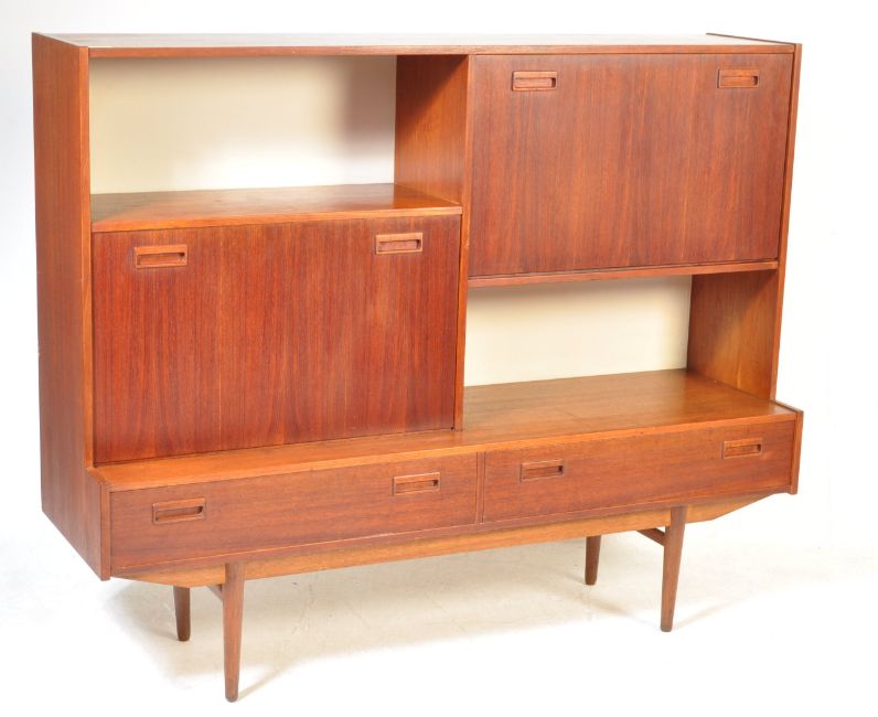 A vintage retro mid 20th century circa 1960’s Modulus Netherlands / Dutch Fristho Franeker teak wood sideboard credenza / highboard / wall unit. The unit having twin drop front cupboards atop with open cupboard above two long drawers raised on turned legs. Measures: 123cm x 151cm x 44cm.