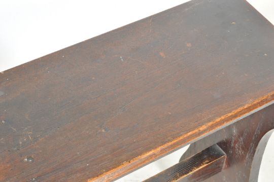 An early 20th century oak ecclesiastical Gothic church stool in the manner of Pugin having faceted edges to the seat raised on splayed feet united by a single stretcher.