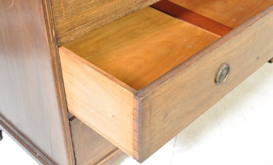 An early 20th century Edwardian mahogany chest of drawers of a long rectangular form with shall gallery back having 2 over 2 drawers configuration raised on shaped feet