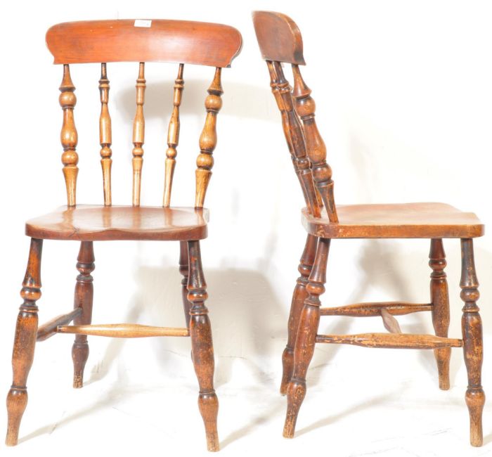 A set of four 19th century Victorian pine farmhouse kitchen chairs / dining chairs having a curved backrest, spindle back, saddle seat raised on turned legs united by stretchers. Measures approx. 88cm x 46cm x 38cm.