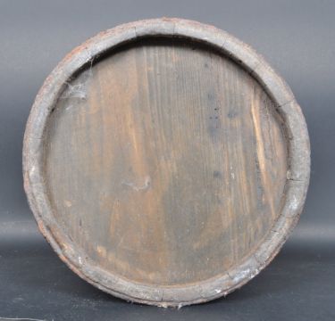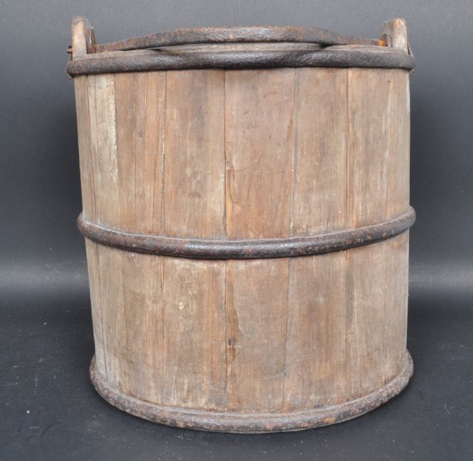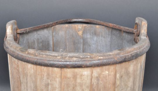 A large early 20th century continental farm house wooden bucket. The bucket having a forged  swing handle with three forged ring to the body. Measures 30cm high.