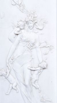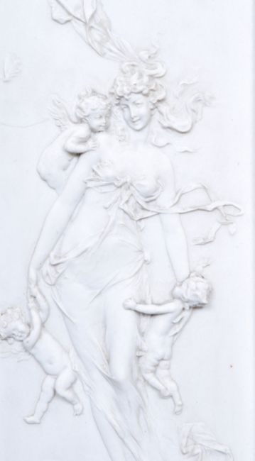 A 20th century Neoclassical Grand Tour style reproduction carved marble panel in the manner of Francois Duquesnoy. The picture being carved in relief featuring a Venus surrounded by classical putti. Within an ornate gilt frame. Measures 54cm 26cm.