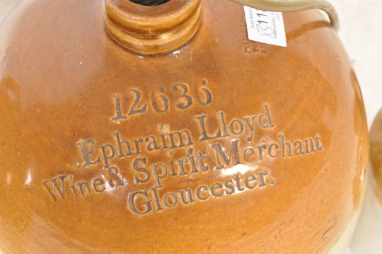 A collection of three vintage 20th century stone items comprising of a converted stoneware flagon / lamp inscribed Ephraim Lloyd Wine & Spirit Merchant, a flagon inscribed 4468 Penny Yeovil. Largest measures 70cm.
