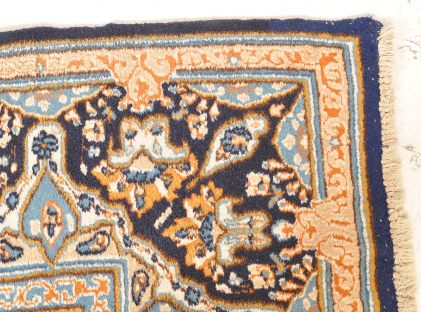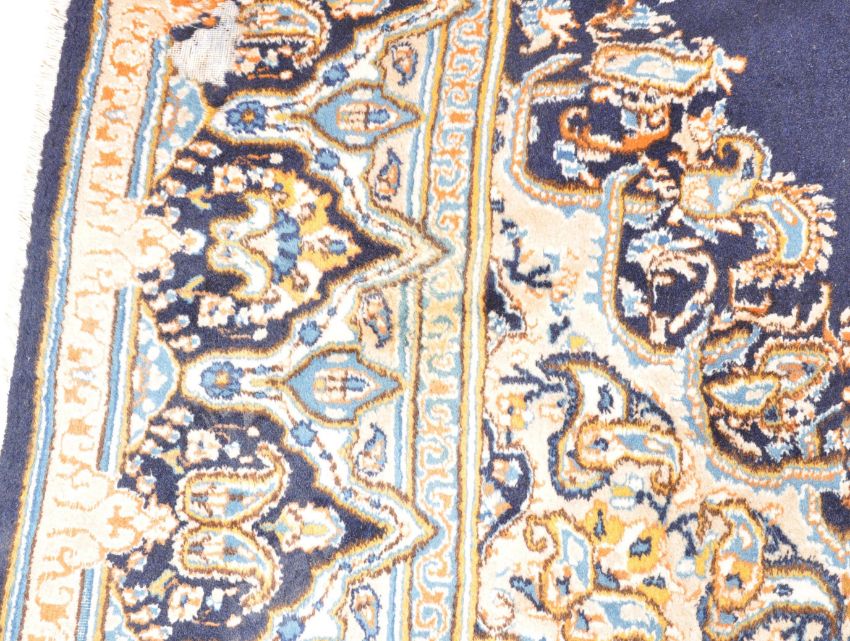 A large 20th century Persian Islamic Kirman rug / carpet. The rug having a large foliate decorated medallion to the centre set on a blue background with foliate floral stylised motifs to the corners and main border. Measures approx. 317cm x 222cm
