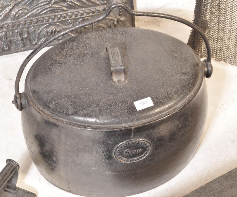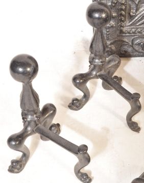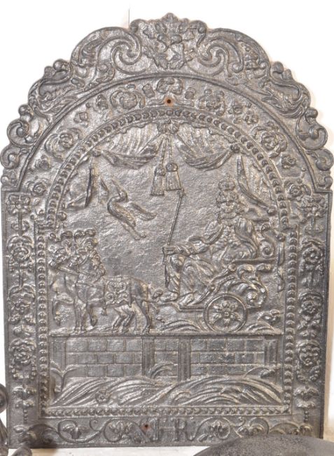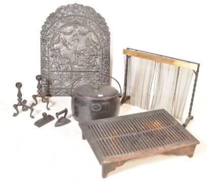 A circa 1900 Inglenook cast iron fire set comprising of an ornate back plate, andirons, grate together with a warming iron. Largest measures 95cm x 71cm.
