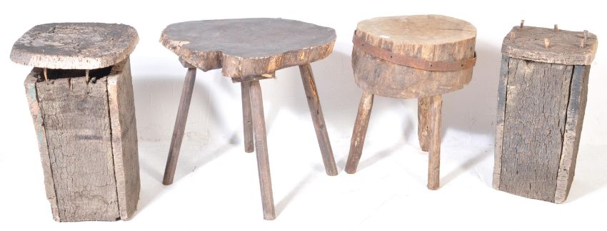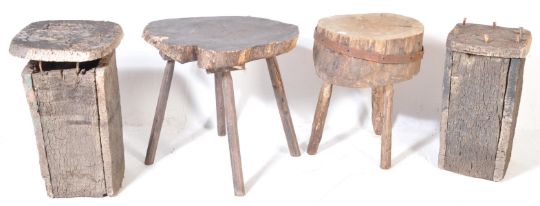 A collection of rustic 20th century reclaimed wood furniture to include a table of circular form with iron coopering raised on three legs, together with three other items.