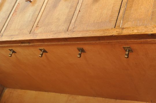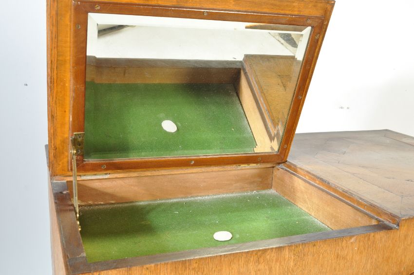 An early 20th century circa 1930’s Art Deco oak gentleman's bachelor compactum. The wardrobe having a single full length door to the right and a bank of six drawers to the left with block handles, metamorphic mirror raised on shaped supports. Measures approx. 137cm x 93cm x 55cm