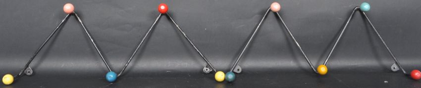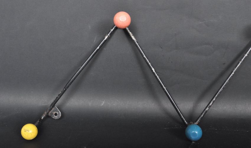 A pair of vintage retro mid 20th century atomic / sputnik inspired coat hooks / rack. The rack having W shape metal wired body with wooden colourful spherical  ball finial hooks.